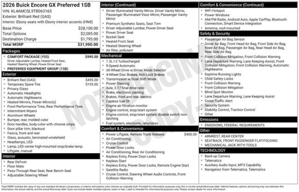 Brilliant Red 2026 Buick Encore GX Preferred 4D Sport Utility AWD ECOTEC 1.3L Turbo 9-Speed Automatic Encore GX Preferred, 4D Sport Utility, ECOTEC 1.3L Turbo, 9-Speed Automatic, AWD, Brilliant Red, Ebony Seats With Ebony Interior Accents Premium Synthetic, 2-Way Power Driver Lumbar Control, 8-Way Power Driver Seat Adjuster, Comfort Package, Flat-Folding Front Passenger Seatback, Heated Driver & Front Passenger Seats, Heated Steering Wheel, Preferred Equipment Group 1SB, Rear Center Armrest.