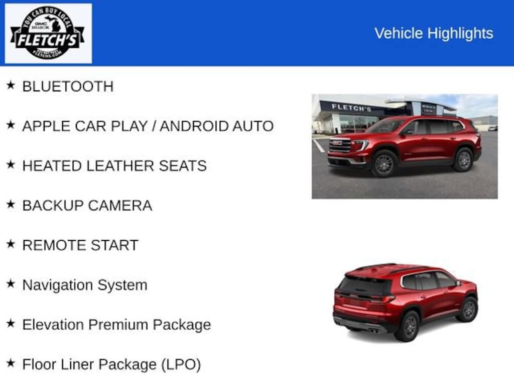Indulge in the convenience of cutting-edge technology, including Bluetooth connectivity, Apple CarPlay/Android Auto integration, and a backup camera. Elevate your comfort with the Acadia's heated leather seats, remote start, and the Luxury Package's premium amenities. Enjoy the added peace of mind with the Elevation Premium Package, which includes a Navigation System, 8-inch Diagonal Head-Up Display, and Integrated Cargo Liner.