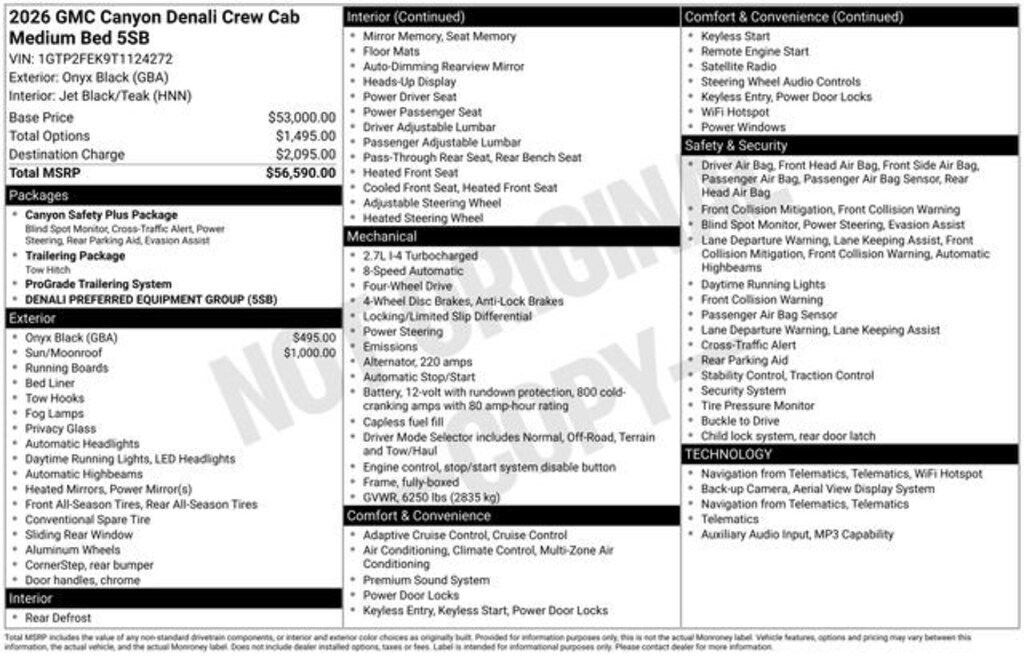 Recent Arrival! Onyx Black 2026 GMC Canyon Denali 4D Crew Cab 4WD 2.7L I4 Turbocharged DOHC 16V LEV3-SULEV30 310hp 8-Speed Automatic