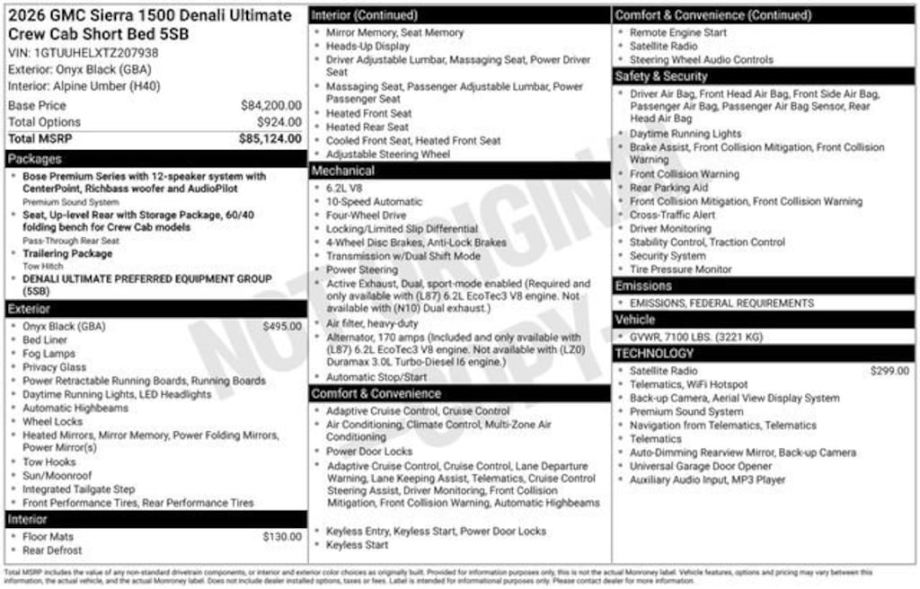Recent Arrival! Onyx Black 2026 GMC Sierra 1500 Denali Ultimate 4D Crew Cab 4WD EcoTec3 6.2L V8 10-Speed Automatic Sierra 1500 Denali Ultimate, 4D Crew Cab, EcoTec3 6.2L V8, 10-Speed Automatic, 4WD, Onyx Black, Alpine Umber Leather, 120-Volt Bed Mounted Power Outlet, 120-Volt Interior Power Outlet, 2 Charge/Data USB Ports Inside Center Console, 2 Type-C Charge-Only Rear USB Ports, 2 USB Ports, Auto-Locking Rear Differential, Bed View Camera, Bose Premium Series w/12-Speaker System, Chrome Recovery Hooks, Color-Keyed Carpeting Floor Covering, Deep-Tinted Glass, Electric Rear-Window Defogger, Floor-Mounted Center Console, Front Rain-Sensing Wipers, HD Surround Vision, Heated 2nd Row Outboard Seats, Heated Driver & Front Outboard Passenger Seating, Heavy-Duty Air Filter, High Gloss Black Header w/Signature Denali Grille, Hill Descent Control, Hitch Guidance, Hitch View, In-Vehicle Trailering System App, Integrated Trailer Brake Controller, Keyless Open & Start, LED Cargo Area Lighting, Multicolor 15 Diagonal Head-Up Display, MultiPro Tailgate Audio System by Kicker (LPO), Navigation System, OnStar Services Capable, Perimeter Lighting, Power Door Locks, Power Front Passenger Windows w/Express Up/Down, Power Front Windows w/Driver Express Up/Down, Power Rake & Telescoping Steering Column, Power Rear Windows w/Express Down, Power Sliding Rear Window w/Rear Defogger, Power Sunroof, Preferred Equipment Group 5SB, Push Button Start, Rear Cross Traffic Braking, Rear Pedestrian Detection, Rear Wheelhouse Liners, Remote Vehicle Starter System, SiriusXM w/360L Trial Subscription, Spray-On Pickup Bedliner w/GMC Logo, Steering Wheel Audio Controls, Theft Deterrent System (Unauthorized Entry), Trailer Camera Provisions, Trailer Side Blind Zone Alert, Trailer Tire Pressure Monitor System, Trailering Package, Ultrasonic Front & Rear Park Assist, Universal Home Remote, Ventilated Driver & Front Passenger Seats, Wi-Fi Hotspot Capable, Wireless Charging.