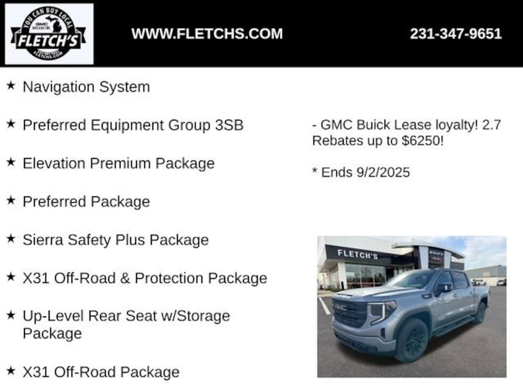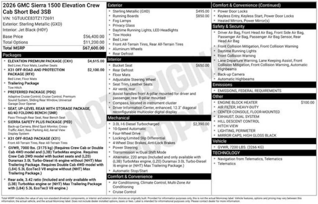 Sterling Metallic 2026 GMC Sierra 1500 Elevation 4D Crew Cab 4WD 3.0L I6 10-Speed Automatic Sierra 1500 Elevation, 4D Crew Cab, 3.0L I6, 10-Speed Automatic, 4WD, Sterling Metallic, Black Leather, 120-Volt Bed Mounted Power Outlet, 120-Volt Interior Power Outlet, 2 Charge/Data USB Ports, 2 Type-C Charge-Only Rear USB Ports, 6-Speaker Audio System Feature, Adaptive Cruise Control, All-Weather Floor Liner (LPO), Auto-Locking Rear Differential, Body Color Header w/Gloss Black Mesh Grille Bars, Color-Keyed Carpeting Floor Covering, Deep-Tinted Glass, Dual Exhaust System, Electric Rear-Window Defogger, Elevation Premium Package, Front Frame-Mounted Black Recovery Hooks, Front Rubberized-Vinyl Floor Mats, HD Rear Vision Camera, HD Surround Vision, Heavy-Duty Air Filter, High Capacity Suspension Package, High Gloss Black Mirror Caps, Hill Descent Control, Hitch Guidance, Hitch View, In-Vehicle Trailering System App, Integrated Trailer Brake Controller, Keyless Open & Start, Leather-Appointed Seat Trim, LED Cargo Area Lighting, Manual Tilt-Wheel & Telescoping Steering Column, Navigation System, Off-Road Suspension, OnStar Services Capable, Perimeter Lighting, Power Door Locks, Power Front Windows w/Driver Express Up/Down, Power Front Windows w/Passenger Express Down, Power Rear Windows w/Express Down, Power Sliding Rear Window w/Rear Defogger, Preferred Equipment Group 3SB, Preferred Package, Premium Bose 7-Speaker Sound System, Push Button Start, Rear Cross Traffic Braking, Rear Pedestrian Detection, Rear Rubberized-Vinyl Floor Mats, Rear Wheelhouse Liners, Remote Vehicle Starter System, Sierra Safety Plus Package, SiriusXM w/360L Trial Subscription, Spray-On Pickup Bedliner w/GMC Logo, Steering Wheel Audio Controls, Theft Deterrent System (Unauthorized Entry), Trailer Camera Provisions, Trailer Side Blind Zone Alert, Trailering Package, Ultrasonic Front & Rear Park Assist, Universal Home Remote, Up-Level Rear Seat w/Storage Package, Wi-Fi Hotspot Capable, X31 Hard Badge, X31 Off-Road & Protection Package, X31 Off-Road Package.
