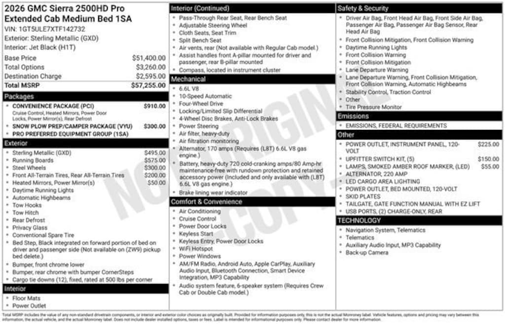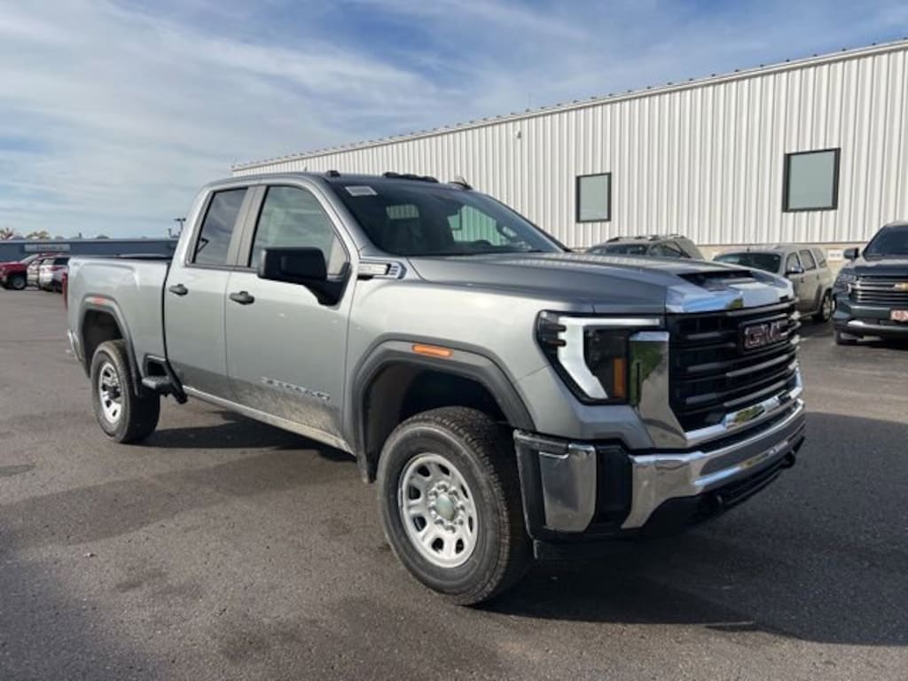 Sterling Metallic 2026 GMC Sierra 2500HD Pro Double Cab 4WD 6.6L V8 10-Speed Automatic Sierra 2500HD Pro, Double Cab, 6.6L V8, 10-Speed Automatic, 4WD, Sterling Metallic, Black Cloth, 2 Charge/Data USB Ports, 2-Speed Electronic Shift Transfer Case, 220-Amp Alternator, Chrome Grille w/Flat Black Grille Insert Bars, Convenience Package, Deep-Tinted Glass, Electric Rear-Window Defogger, EZ Lift Power Lock & Release Tailgate, LED Cargo Area Lighting, OnStar Services Capable, Outside Power-Adjustable Black Mirrors, Preferred Equipment Group 1SA, Push Button Start, Remote Keyless Entry, Snow Plow Prep/Camper Package, Solar Absorbing Tinted Glass, Suspension Package, Wireless Phone Projection.