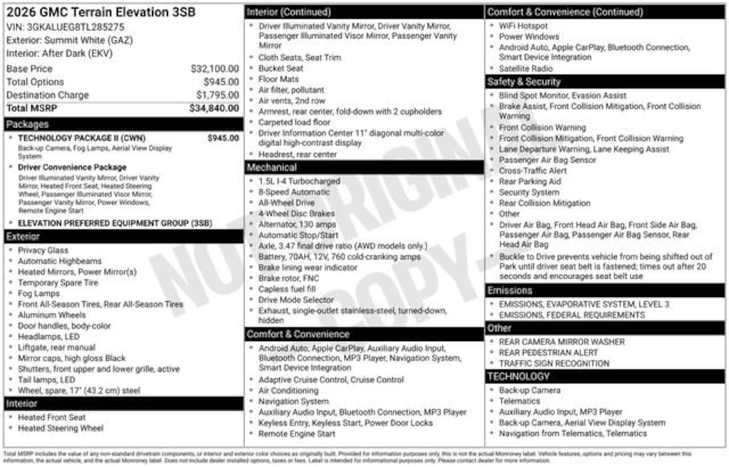 Recent Arrival! Summit White 2026 GMC Terrain Elevation 4D Sport Utility AWD 1.5L DOHC 8-Speed Automatic with Overdrive Terrain Elevation, 4D Sport Utility, 1.5L DOHC, 8-Speed Automatic with Overdrive, AWD, Summit White, After Dark Cloth, Front LED Fog Lamps, HD Surround Vision, Navigation System, Preferred Equipment Group 3SB, Rear Camera Mirror, Rear Camera Mirror Washer, Rear Pedestrian Alert, Technology Package II, Traffic Sign Recognition.