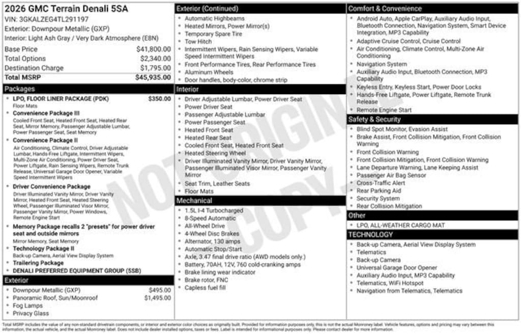 Downpour Metallic 2026 GMC Terrain Denali 4D Sport Utility AWD 1.5L DOHC 8-Speed Automatic with Overdrive Terrain Denali, 4D Sport Utility, 1.5L DOHC, 8-Speed Automatic with Overdrive, AWD, Downpour Metallic, Light Ash Gray / Very Dark Atmosphere Leather, All-Weather Cargo Mat (LPO), Floor Liner Package (LPO), Front All-Weather Floor Liners (LPO), Navigation System, Preferred Equipment Group 5SB, Second Row All-Weather Mat (LPO).