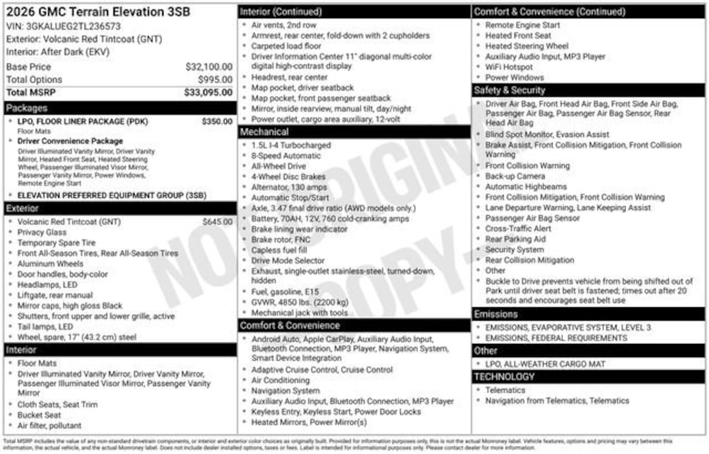 Recent Arrival! Volcanic Red Tintcoat 2026 GMC Terrain Elevation 4D Sport Utility AWD 1.5L DOHC 8-Speed Automatic with Overdrive Terrain Elevation, 4D Sport Utility, 1.5L DOHC, 8-Speed Automatic with Overdrive, AWD, Volcanic Red Tintcoat, After Dark Cloth, All-Weather Cargo Mat (LPO), Floor Liner Package (LPO), Front All-Weather Floor Liners (LPO), Navigation System, Preferred Equipment Group 3SB, Second Row All-Weather Mat (LPO).Our family has been committed to serving the Petoskey community for decades, from providing the city's school buses to offering a fantastic selection of new and used cars, trucks and SUVs in our Michigan Buick GMC Audi dealership. We strive to be your trusted dealership of choice, and we think we know a thing or two about how to do that thanks to a long legacy satisfying customer needs and being an active participant in the community in Petoskey and beyond.