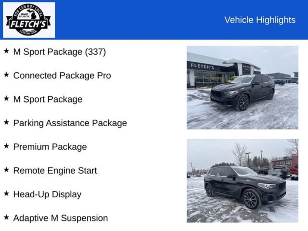 Recent Arrival! Carbon Black Metallic 2022 BMW X5 xDrive40i 4D Sport UtilityX5 xDrive40i, 4D Sport Utility, 3.0L I6 DOHC 24V TwinPower Turbo, 8-Speed Automatic Sport, AWD, Carbon Black Metallic, Ivory White Leather, Active Park Distance Control, Adaptive M Suspension, Aerodynamic Kit, Connected Package Pro, Drive Recorder, Gesture Control, Head-Up Display, High-Gloss Shadowline Roof Rails, M Sport Package, M Sport Package (337), M Steering Wheel, Parking Assistance Package, Parking Assistant Plus, Premium Package, Rear-View Camera, Remote Engine Start, Shadowline Exterior Trim, Surround View w/3D View, Vernasca Leather Upholstery, Wheels: 20 x 9 M Star-Spoke Bi-Color, Without Lines Designation Outside.21/25 City/Highway MPGAs you do your comparison shopping, you will see Fletch's Of Petoskey offers some of the best values in the market. We will provide you a Carfax, Comprehensive Vehicle Inspection, and how we arrived at the price. We may not always be the lowest but if you want to know who is; we will show you that too. Call or Stop by Fletch's of Petoskey, Michigan to schedule a test drive today.