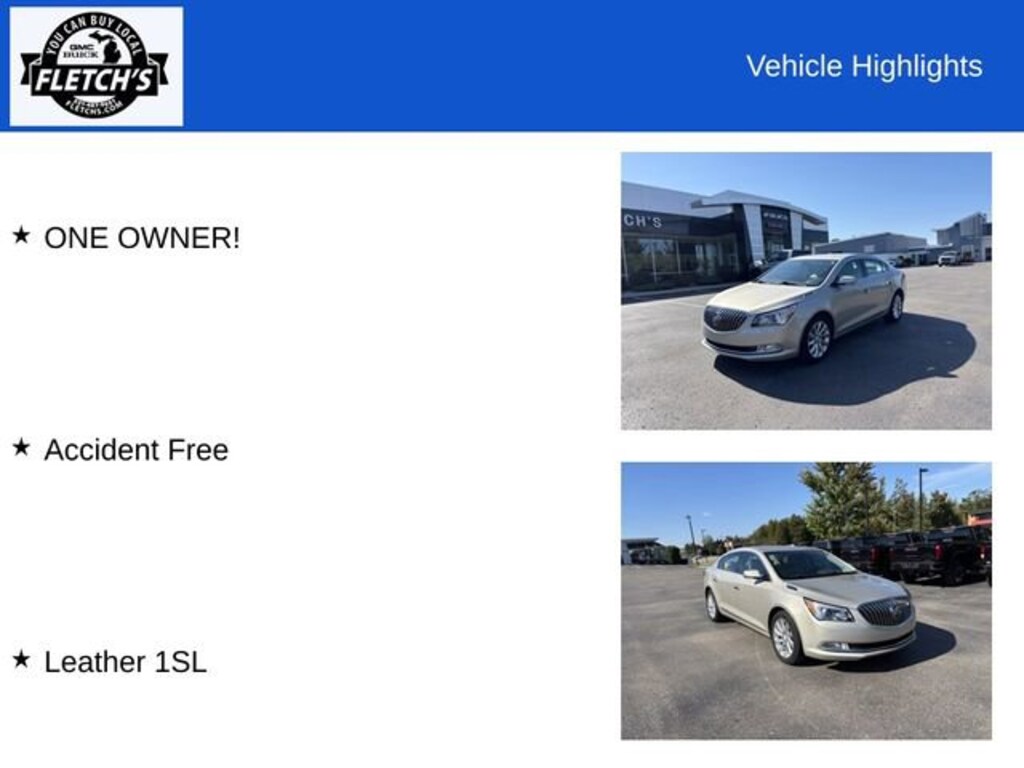Recent Arrival! Champagne Silver Metallic 2014 Buick LaCrosse Leather Group 4D Sedan CARFAX One-Owner. Clean CARFAX. Once you've found your perfect match, our hassle-free delivery process ensures that your dream car is delivered to your doorstep promptly and securely!ONE OWNER!, Accident Free, LaCrosse Leather Group, 4D Sedan, 3.6L V6 E85 Flex Fuel SIDI DOHC VVT, 6-Speed Automatic Electronic with Overdrive, FWD, Champagne Silver Metallic, Light Neutral Leather, Leather 1SL.Odometer is 46911 miles below market average! 18/28 City/Highway MPGAwards:* 2014 KBB.com Brand Image Awards As you do your comparison shopping, you will see Fletch's Of Petoskey offers some of the best values in the market. We will provide you a Carfax, Comprehensive Vehicle Inspection, and how we arrived at the price. We may not always be the lowest but if you want to know who is; we will show you that too. Call or Stop by Fletch's of Petoskey, Michigan to schedule a test drive today.Reviews:* There are many edge-of-luxury sedans that offer decent performance with impressive efficiency at a competitive price, but if you are pleasantly surprised to find those qualities from a traditional American brand, the Buick LaCrosse belongs on your short list. Source: KBB.com* Elegant interior styling; smooth and quiet ride; hybrid's respectable fuel economy; available all-wheel drive; many available safety features; top crash test scores. Source: Edmunds