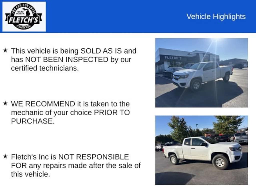Recent Arrival! Summit White 2016 Chevrolet Colorado Work Truck Fletchâs Wholesale to the Public offers the consumer the ability to buy a vehicle at pre auction pricing. This vehicle is likely to have multiple mechanical and or auto body defects. WE RECOMMEND it is taken to the mechanic of your choice PRIOR TO PURCHASE. All vehicles displayed Wholesale to the Public are sold AS IS. The term AS IS means that there is absolutely NO expressed or implied warranty of condition or fitness for a particular purpose. This applies to both the mechanical and cosmetic condition of the AS IS vehicles. The purchaser of an AS IS vehicle will pay all cost for any repairs. Fletchâs assumes no responsibility for any repairs regardless of any verbal statements made about any vehicle in the Wholesale to the Public section.This vehicle is being SOLD AS IS and has NOT BEEN INSPECTED by our certified technicians., WE RECOMMEND it is taken to the mechanic of your choice PRIOR TO PURCHASE., Fletch's Inc is NOT RESPONSIBLE FOR any repairs made after the sale of this vehicle., Colorado Work Truck, 2.5L 4-Cylinder DOHC, 6-Speed Automatic, 4WD, Summit White, Jet Black/Dark Ash Cloth.19/25 City/Highway MPG Priced below KBB Fair Purchase Price!Awards:* JD Power Automotive Performance, Execution and Layout (APEAL) Study * Motor Trend Truck of the Year * 2016 KBB.com 5-Year Cost to Own Awards * 2016 KBB.com Best Resale Value Awards * 2016 KBB.com Best Buy Awards FinalistReviews:* Comfortable ride; capable and fuel-efficient diesel engine; many available high-tech features; maneuverable size. Source: Edmunds