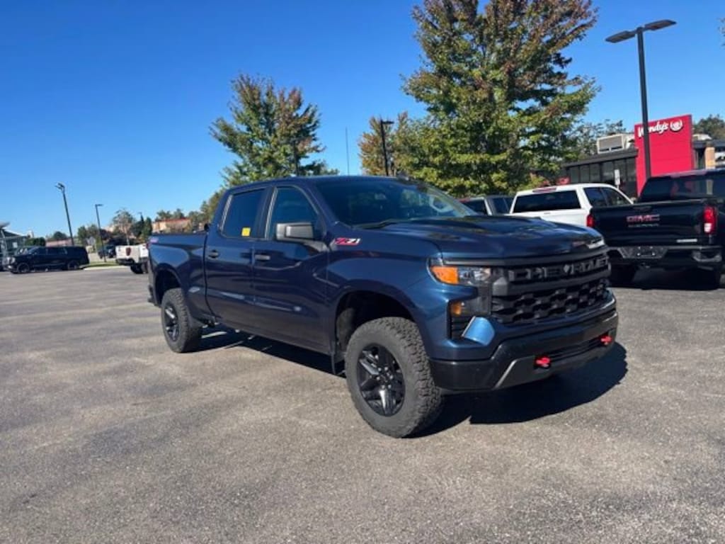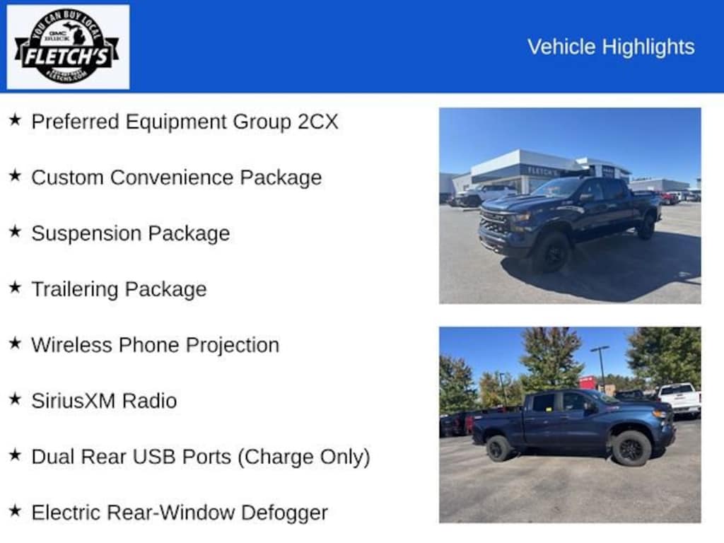 Silverado 1500 Custom Trail Boss, 4D Crew Cab, EcoTec3 5.3L V8, 10-Speed Automatic, 4WD, Northsky Blue Metallic, Black Cloth, 10-Way Power Driver Seat w/Lumbar, 120-Volt Instrument Panel Power Outlet, 3.5 Monochromatic Display Driver Info Center, Auto-Locking Rear Differential, Bluetooth® For Phone, Color-Keyed Carpeting Floor Covering, Compass, Custom Convenience Package, Deep-Tinted Glass, Dual Rear USB Ports (Charge Only), Electric Rear-Window Defogger, Electrical Steering Column Lock, Electronic Cruise Control, EZ Lift Power Lock & Release Tailgate, Front Rubberized Vinyl Floor Mats, HD Rear Vision Camera, Heavy-Duty Air Filter, Hill Descent Control, LED Cargo Area Lighting, Manual Tilt Wheel Steering Column, OnStar & Chevrolet Connected Services Capable, Performance Red Recovery Hooks, Power Front Windows w/Driver Express Up/Down, Power Front Windows w/Passenger Express Down, Power Rear Windows w/Express Down, Preferred Equipment Group 2CX, Rear 60/40 Folding Bench Seat (Folds Up), Rear Rubberized-Vinyl Floor Mats, Remote Keyless Entry, Remote Vehicle Starter System, SiriusXM Radio, Standard Tailgate, Suspension Package, Theft Deterrent System (Unauthorized Entry), Trailering Package, Wireless Phone Projection.