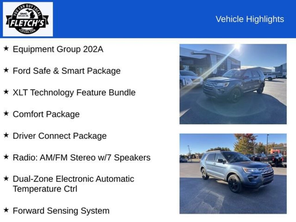 Explorer XLT, 4D Sport Utility, 3.5L 6-Cylinder SMPI DOHC, 6-Speed Automatic with Select-Shift, 4WD, Blue Metallic, Medium Light Stone Premium Synthetic, 8-Way Power Passenger Seat, Adaptive Cruise Control & Fwd Collision Warning, Auto High-Beam Headlights, Comfort Package, Driver Connect Package, Dual-Zone Electronic Automatic Temperature Ctrl, Equipment Group 202A, Ford Safe & Smart Package, Forward Sensing System, Heated Steering Wheel, Lane-Keeping System, LED Fog Lamps, LED Signature Lighting, Power & Heated Glass Sideview Mirrors, Power Liftgate, Radio: AM/FM Stereo w/7 Speakers, Rain-Sensing Wipers (Front Only), Remote Start System, XLT Technology Feature Bundle.