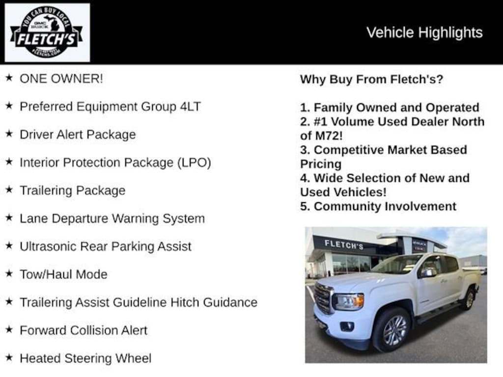 Summit White 2019 GMC Canyon SLT 4D Crew Cab CARFAX One-Owner. Clean CARFAX. Once you've found your perfect match, our hassle-free delivery process ensures that your dream car is delivered to your doorstep promptly and securely!ONE OWNER!, Canyon SLT, 4D Crew Cab, V6, 8-Speed Automatic, 4WD, Summit White, Cocoa/Dune Leather, All-Weather Floor Mats, Driver Alert Package, Forward Collision Alert, Heated Steering Wheel, Interior Protection Package (LPO), Lane Departure Warning System, Preferred Equipment Group 4LT, Rubber Bed Mat, Tow/Haul Mode, Trailering Assist Guideline Hitch Guidance, Trailering Package, Ultrasonic Rear Parking Assist.Odometer is 41541 miles below market average! 17/24 City/Highway MPG Priced below KBB Fair Purchase Price!As you do your comparison shopping, you will see Fletch's Of Petoskey offers some of the best values in the market. We will provide you a Carfax, Comprehensive Vehicle Inspection, and how we arrived at the price. We may not always be the lowest but if you want to know who is; we will show you that too. Call or Stop by Fletch's of Petoskey, Michigan to schedule a test drive today.