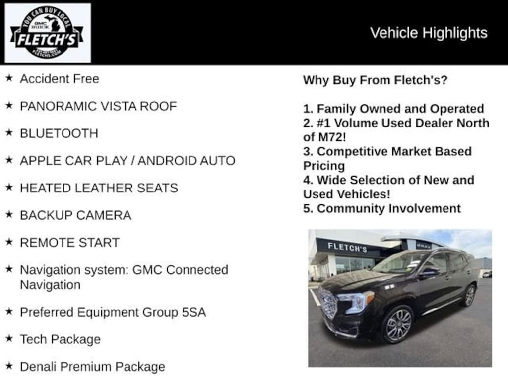 Powered by a 1.5L DOHC engine and a 9-Speed Automatic transmission with AWD, this Terrain Denali delivers an exceptional blend of power and efficiency, with an EPA-estimated 25 MPG in the city and 28 MPG on the highway. The sleek, sophisticated Black exterior is complemented by a wealth of premium features, including a panoramic sunroof, heated and ventilated leather seats, and a premium Bose sound system.