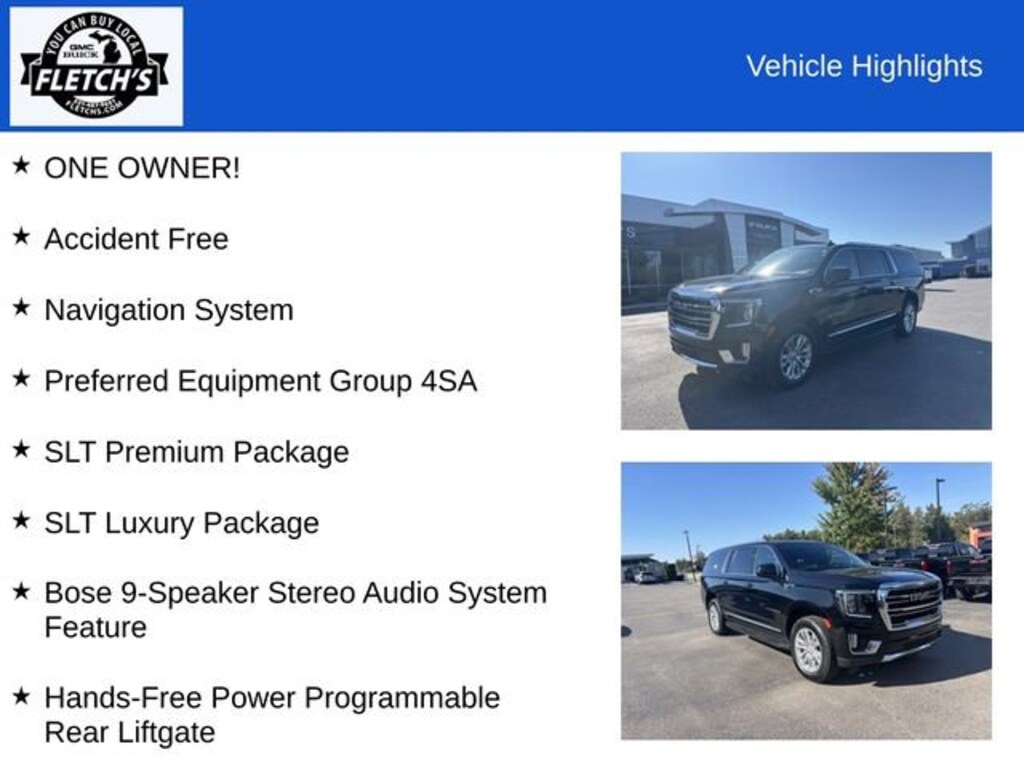 Recent Arrival! New Price! Onyx Black 2022 GMC Yukon XL SLT 4D Sport Utility CARFAX One-Owner. Clean CARFAX. Once you've found your perfect match, our hassle-free delivery process ensures that your dream car is delivered to your doorstep promptly and securely!ONE OWNER!, Accident Free, Yukon XL SLT, 4D Sport Utility, EcoTec3 5.3L V8, 10-Speed Automatic with Overdrive, 4WD, Onyx Black, Jet Black Leather, 2 Presets For Outside Rearview Mirrors, 2 Presets For Power Driver Seat, 3rd Row 60/40 Power-Folding Split-Bench Seat, Automatic Stop/Start, Bose 9-Speaker Stereo Audio System Feature, Bright Chrome Bodyside Moldings, Bright Front & Rear Door Sill Plates, Chrome Door Handles w/Body-Color Strip, Dual-Pane Panoramic Power Sunroof, Hands-Free Power Programmable Rear Liftgate, HD Surround Vision, Heated & Ventilated Driver & Front Passenger Seats, Heated 2nd Row Outboard Position Seats, Heated Driver & Front Passenger Seats, Heated Steering Wheel, Inside Rear-View Auto-Dimming Mirror, Navigation System, Outside Heated Power-Adjustable Mirrors, Power Release 2nd Row 60/40 Split-Folding Bench Seat, Power Tilt & Telescopic Steering Column, Preferred Equipment Group 4SA, Rear Pedestrian Alert, Safety Alert Seat, SLT Luxury Package, SLT Premium Package, Start/Stop System Disable Button, Universal Home Remote, Wireless Charging.15/19 City/Highway MPGAs you do your comparison shopping, you will see Fletch's Of Petoskey offers some of the best values in the market. We will provide you a Carfax, Comprehensive Vehicle Inspection, and how we arrived at the price. We may not always be the lowest but if you want to know who is; we will show you that too. Call or Stop by Fletch's of Petoskey, Michigan to schedule a test drive today.