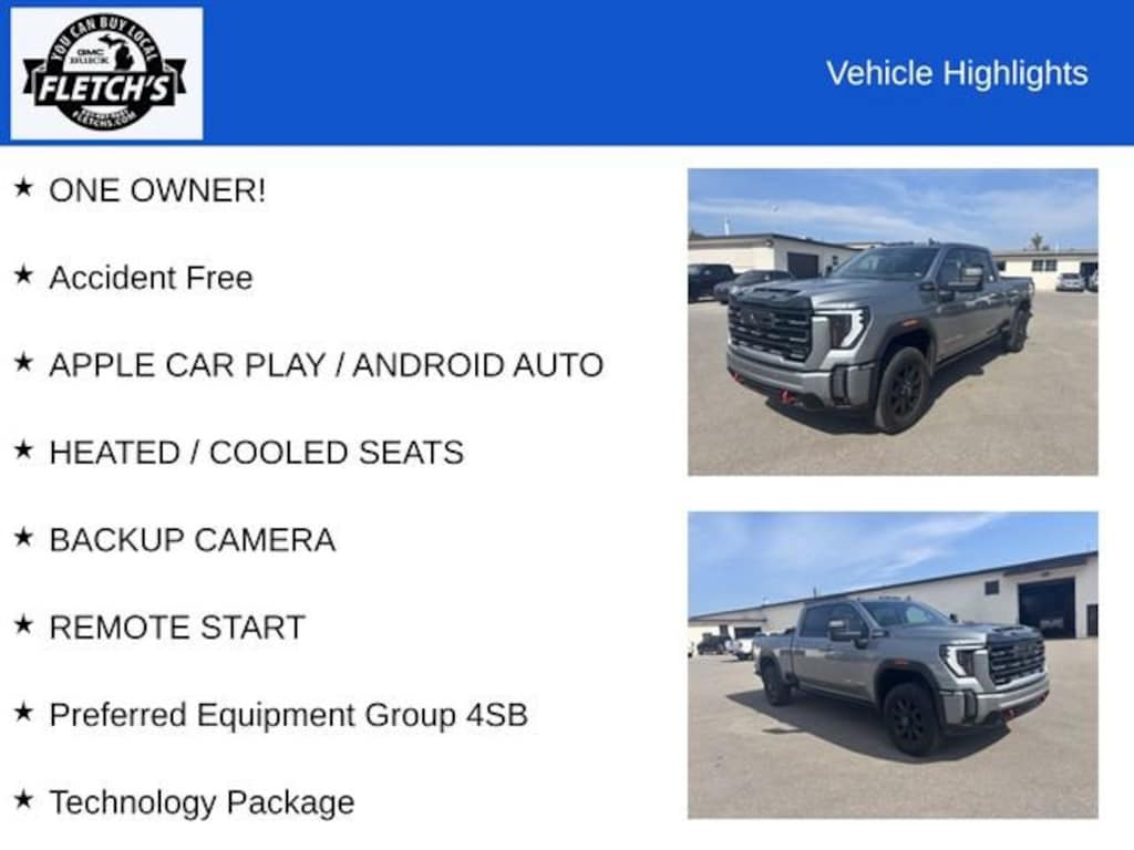 Sterling Metallic 2024 GMC Sierra 3500HD AT4 4D Crew Cab CARFAX One-Owner. Clean CARFAX.ONE OWNER!, Accident Free, APPLE CAR PLAY / ANDROID AUTO, HEATED / COOLED SEATS, BACKUP CAMERA, REMOTE START, Sierra 3500HD AT4, 4D Crew Cab, Duramax 6.6L V8 Turbodiesel, 10-Speed Automatic, 4WD, Sterling Metallic, Jet Black With Kalahari Accents Leather, 120-Volt Bed Mounted Power Outlet, 120-Volt Instrument Panel Power Outlet, 2 Charge-Only Rear USB Ports, 2 Charge/Data USB Ports Inside Center Console, 2 USB Ports, 2-Speed Active Transfer Case, 220 Amp Alternator, Adaptive Cruise Control, AT4 Preferred Package, AT4 Premium Plus Package, Bed View Camera w/2 Trailer Camera Provisions, Bose Premium 7-Speaker Sound System, Deep-Tinted Glass, Electric Rear-Window Defogger, Floor-Mounted Center Console, Front Rain-Sensing Wipers, Gloss Black Header & Grille Insert Bars, Gooseneck/5th Wheel Prep Package, HD Surround Vision, Heated 2nd Row Outboard Seats, Heated Driver & Front Outboard Passenger Seats, Integrated Trailer Brake Controller, Keyless Open & Start, LED Cargo Area Lighting, LED Smoked Amber Roof Marker Lamps, Manual Tilt-Wheel/Telescoping Steering Column, Off-Road High Clearance Step (LPO), Power Front Windows w/Passenger Express Up/Down, Power Sliding Rear Window w/Defogger, Power Sunroof, Preferred Equipment Group 4SB, Prem Front Floor Liners w/Removable Carpet Insert, Prem Rear Floor Liners w/Removable Carpet Insert, Push Button Start, Rear Cross Traffic Alert, Rear Wheelhouse Liners, Remote Vehicle Starter System, Safety Alert Seat, SiriusXM w/360L, Snow Plow Prep/Camper Package, Spray-On Pickup Bedliner w/AT4 Logo, Steering Wheel Audio Controls, Technology Package, Trailer Camera Provisions, Trailer Side Blind Zone Alert, Unauthorized Entry Theft-Deterrent System, Universal Home Remote, Ventilated Driver & Front Passenger Seats, Wireless Charging, Wireless Phone Projection, X31 Off-Road Package.Odometer is 13646 miles below market average! Priced below KBB Fair Purchase Price!As you do your comparison shopping, you will see Fletch's Of Petoskey offers some of the best values in the market. We will provide you a Carfax, Comprehensive Vehicle Inspection, and how we arrived at the price. We may not always be the lowest but if you want to know who is; we will show you that too. Call or Stop by Fletch's of Petoskey, Michigan to schedule a test drive today.