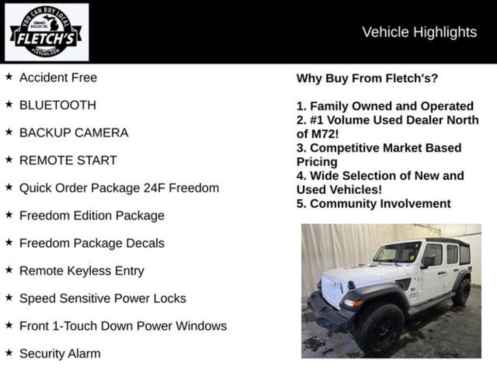 Discover the Thrill of the Open Road in this Stunning 2020 Jeep Wrangler Unlimited Freedom Edition. With its rugged good looks, impressive off-road capabilities, and a wealth of premium features, this Wrangler is the perfect companion for your next adventure. Accident Free BLUETOOTH BACKUP CAMERA REMOTE START 8-Speed Automatic Transmission Dana M200 Rear Axle Hill Descent Control Freedom Edition Package Freedom Package Decals Quick Order Package 24F FreedomPowered by a robust 3.6L V6 engine, this Wrangler delivers exceptional performance both on and off the pavement. Enjoy the freedom of 4-wheel drive and the convenience of an 8-speed automatic transmission, which provides smooth, responsive shifting for a refined driving experience.The Wrangler's iconic design is enhanced by the Freedom Edition's exclusive styling cues, including American Flag decals, the Freedom Edition swing gate plaque, and the Oscar Mike badge. Step into the cabin and you'll be greeted by premium touches like leather-wrapped steering wheel, illuminated sun visors, and the #1 seat foam cushion for unparalleled comfort.Staying connected on the go is a breeze with the Uconnect 3 infotainment system, which features a 5-inch display and integrated Bluetooth connectivity. The ParkView rear backup camera makes navigating tight spaces a cinch, while the remote keyless entry and security alarm provide added peace of mind.Whether you're tackling rugged trails or cruising down the highway, this 2020 Jeep Wrangler Unlimited Freedom Edition is ready to elevate your driving experience. Schedule a test drive today and discover the thrill of owning this exceptional off-road icon.We'll Buy your Car Hassle-Freehttps://www.audipetoskey.com/en/specials-and-finance/value-my-trade/